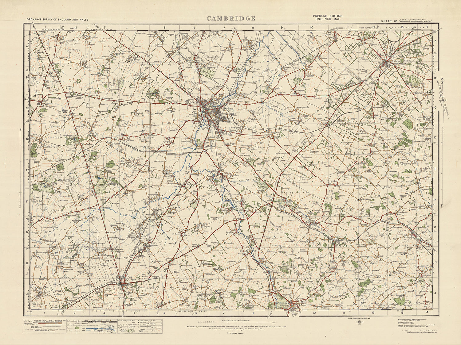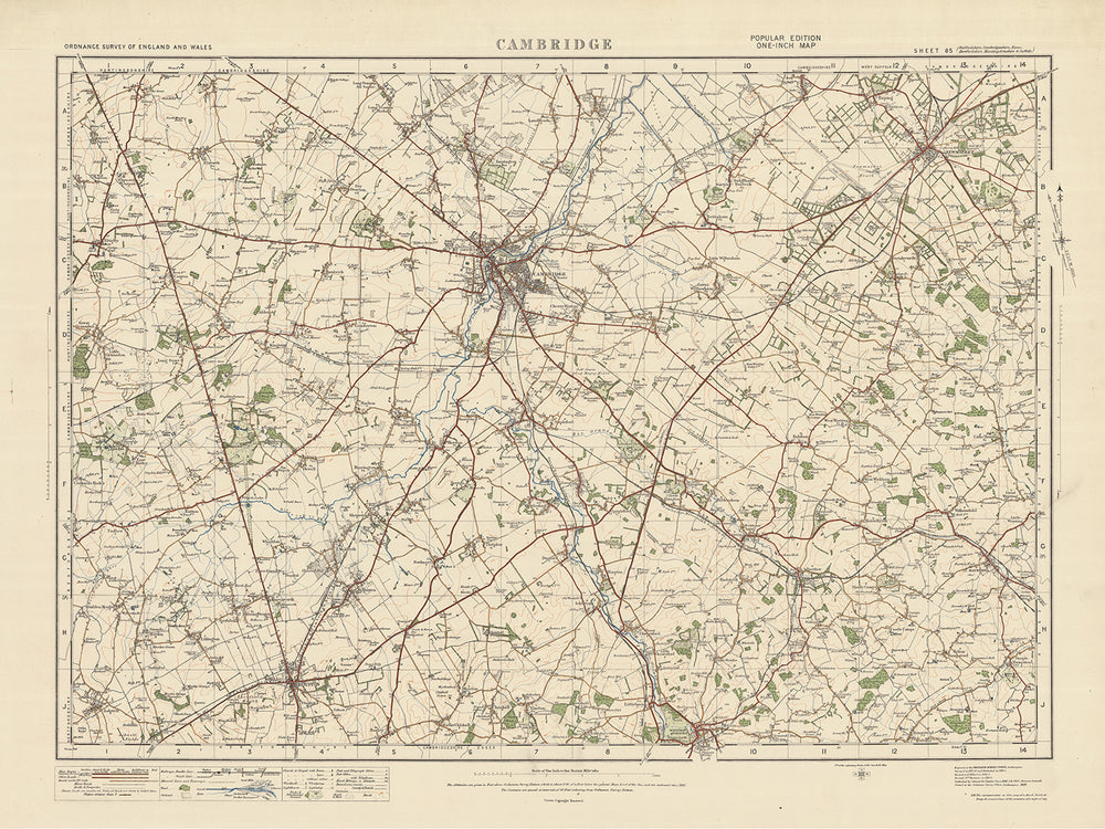 The Old Ordnance Survey Map, Hoja 85 - Cambridge, 1925 es una pieza fascinante de la historia cartográfica que permite vislumbrar el pasado. Este mapa, que forma parte de la edición "Popular" de una pulgada para Inglaterra y Gales, ofrece una representación detallada de la región de Cambridge a principios del siglo XX. Este mapa, que presenta el condado histórico de Cambridgeshire, muestra no solo la ciudad de Cambridge sino también otras ciudades y áreas notables.