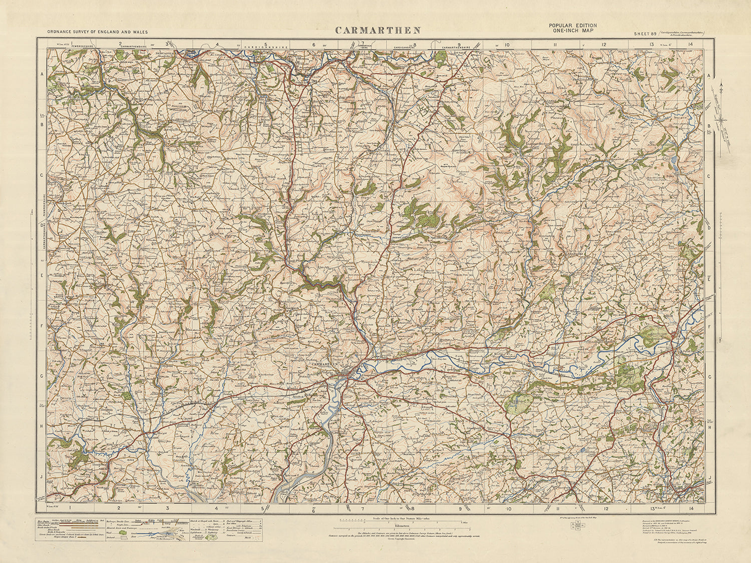 Explore la cautivadora historia y geografía de Carmarthen y las ciudades circundantes con este mapa "Hoja 89 - Carmarthen" meticulosamente elaborado de la edición "Popular" de una pulgada de Ordnance Survey, publicada en 1925.