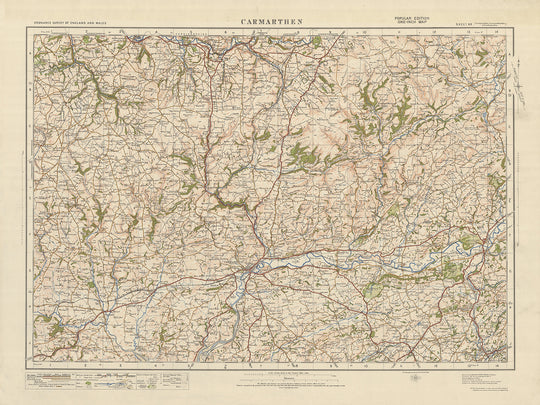 El mapa "Hoja 89 - Carmarthen" de la edición "Popular" de una pulgada de Ordnance Survey, publicada en 1925, ofrece una visión fascinante del pasado con su descripción detallada del histórico condado de Carmarthen en Gales. Este mapa meticulosamente elaborado muestra los pueblos, ciudades y características interesantes de la región, incluidos St Clears, Llandeilo, Ammanford, Llandysul y Newcastle Emlyn.