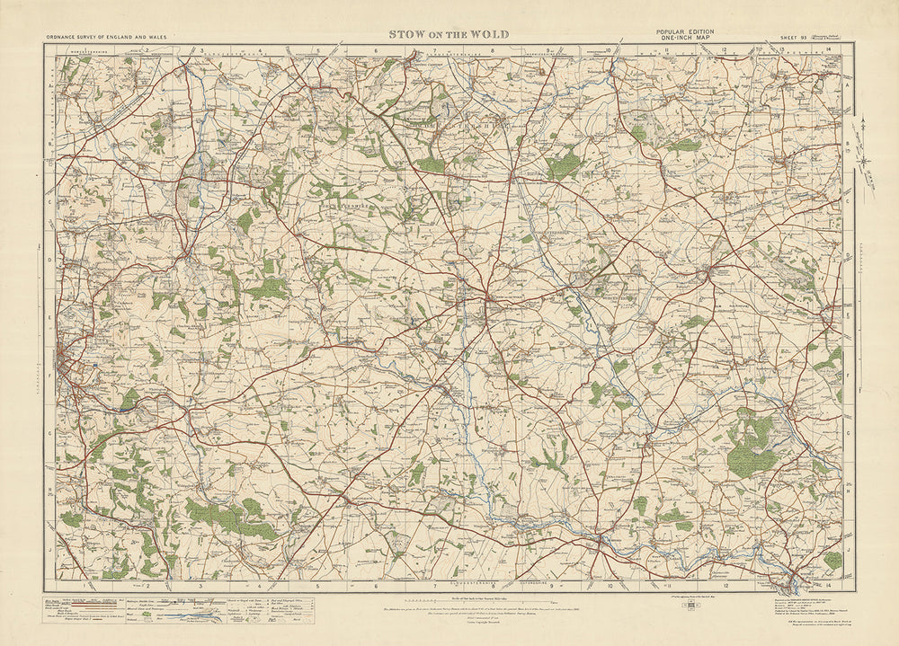 Este antiguo mapa de Ordnance Survey, Hoja 93 - Stow on the Wold, es una pieza fascinante de la historia cartográfica de la famosa edición "Popular" de una pulgada de Inglaterra y Gales, publicada en 1925. El mapa muestra los pueblos, ciudades y lugares interesantes. características de la región, proporcionando una visión única del pasado. Stow on the Wold, una histórica ciudad comercial ubicada en el condado de Gloucestershire, sirve como punto focal de este mapa, rodeada por otros asentamientos notables como Moreton-in-Marsh, Chipping Norton, Bourton-on-the-Water, Witney. y la pintoresca zona de excepcional belleza natural de los Cotswolds (AONB).