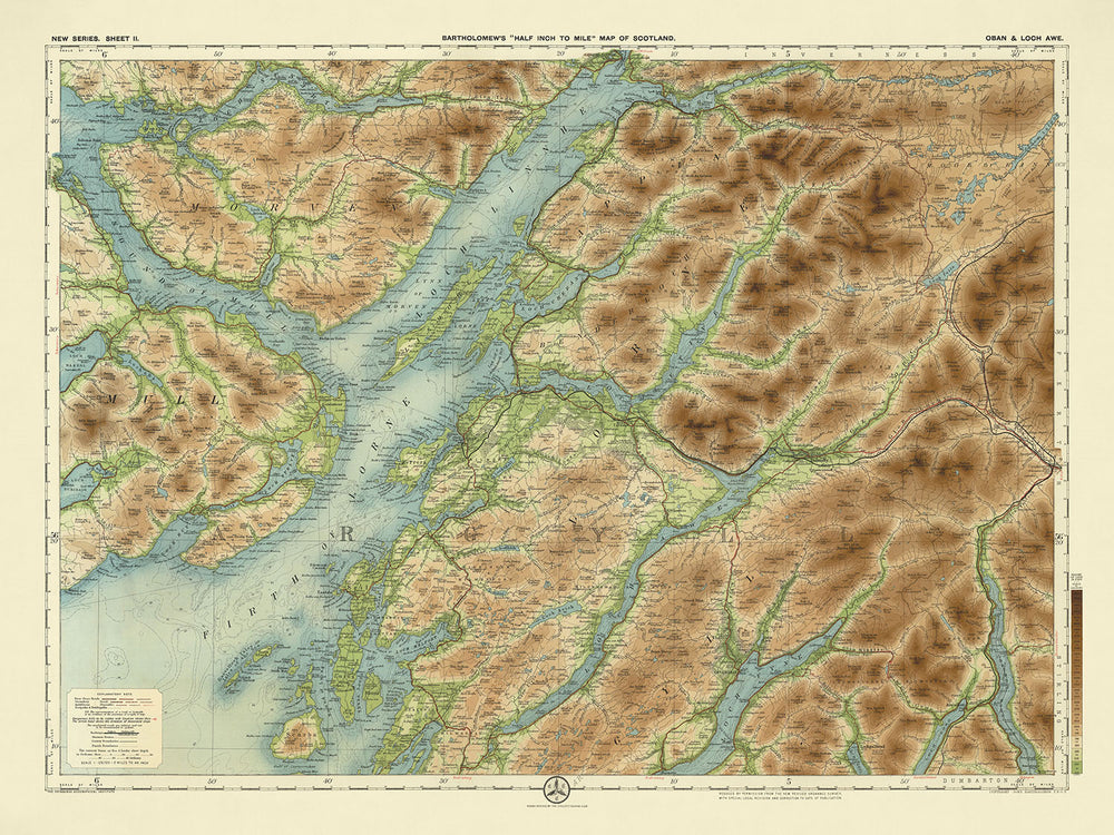 El diseño de este mapa es particularmente llamativo, empleando una orientación paisajística que abarca 36 millas de norte a sur y 52 millas de oeste a este. La cuidadosa gradación de colores no solo resalta la variada topografía, sino que también da vida a la belleza natural de la región. Desde las serenas aguas de Loch Awe y Loch Etive hasta los escarpados picos de Ben Cruachan y Ben More, el mapa captura los dramáticos contrastes del paisaje escocés. La intrincada representación de valles como Glen Coe y Glen Orchy realza aún más el atractivo del mapa, ofreciendo una vista detallada de los valles y vías fluviales de la región.