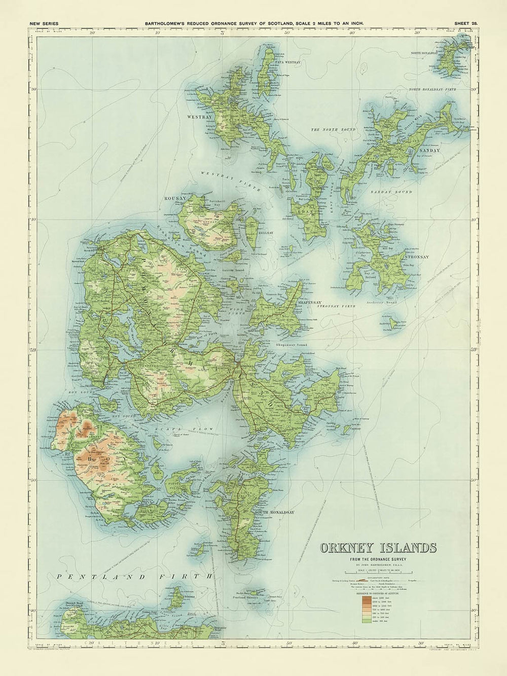 J.G. Bartholomew, un prominente cartógrafo escocés, fue fundamental en el avance de la cartografía temática y el uso del color en los mapas para representar características físicas. Su trabajo en este mapa refleja su dedicación a hacer que la información geográfica sea accesible y atractiva. El mapa de las Islas Orkney se basa en un mapa reducido del Ordnance Survey de la misma época, mostrando la capacidad de Bartholomew para destilar datos geográficos complejos en un formato fácil de leer y estéticamente agradable. Sus mapas eran conocidos por su precisión y claridad, lo que los convertía en herramientas indispensables para viajeros y académicos por igual.