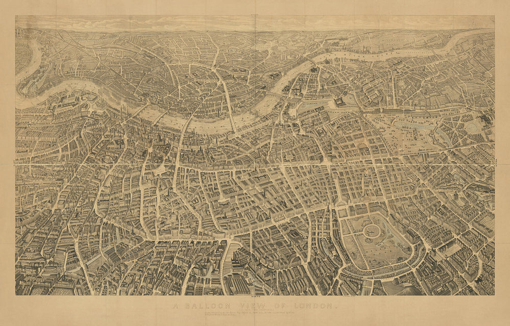 Este mapa de 1851, titulado "Una vista en globo de Londres (vista desde Hampstead)", ofrece una perspectiva única de la ciudad, como si se viera desde un globo aerostático flotando sobre Hampstead Heath. Este extraordinario punto de vista ofrece una vista incomparable del paisaje urbano de Londres durante un período de rápido crecimiento y transformación.