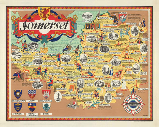 Ilustraciones hermosas y altamente detalladas adornan el mapa, mostrando lugares famosos, pueblos y aspectos importantes de la historia. También se muestran los escudos de armas de Glastonbury, Bath, Bridgwater, Taunton, Weston-super-Mare y Wells, junto con un encantador logo de rosa de los vientos de British Railway de los años 50.