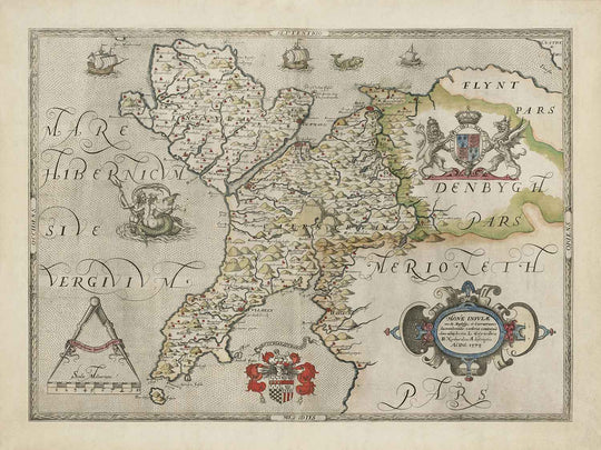 Creada hace casi 450 años, este es el primer mapa impreso y preciso de Anglesey y Gwynedd. Fue publicado originalmente en 1577 por Christopher Saxton, el padre de la cartografía británica. Es un hermoso mapa antiguo, muy detallado y extremadamente raro..