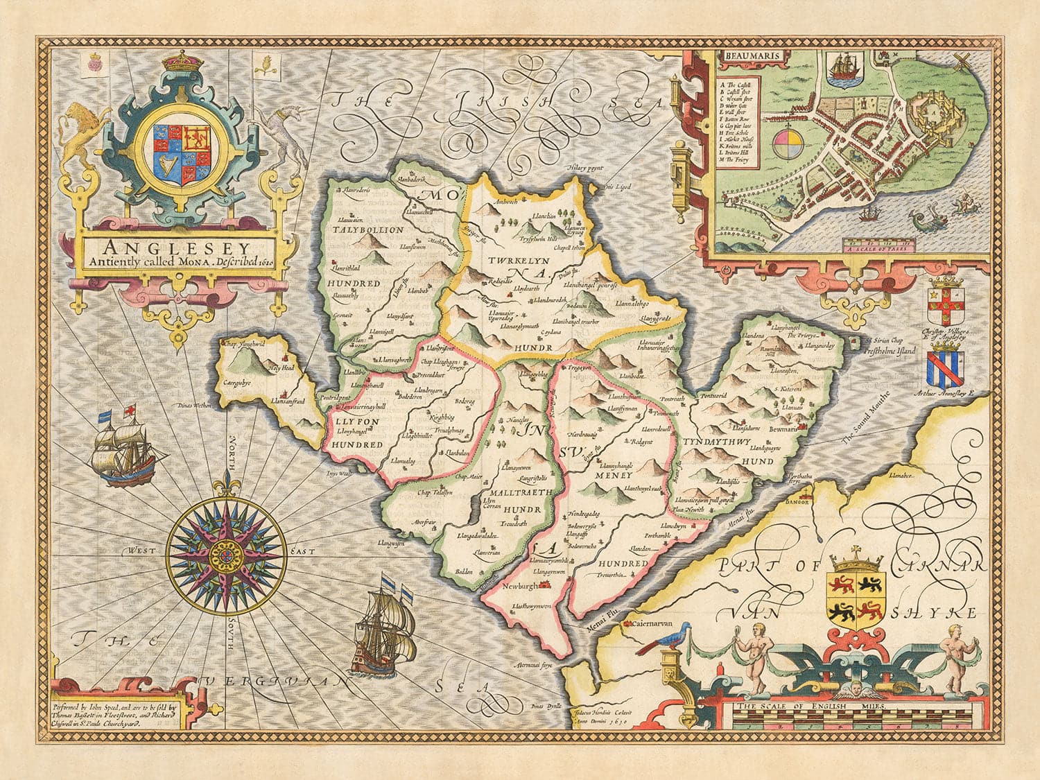 Viejo mapa de Anglesey Wales, 1611 de John Speed - Holyhead, Llanfairpwllgwyngyll, Bangor