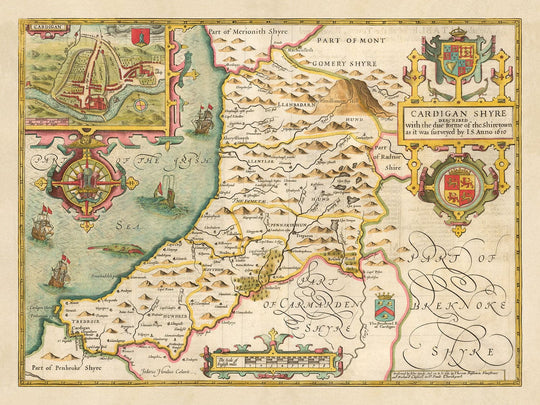 Mapa antiguo de Ceredigion Wales, 1611 por John Speed ​​- Cardiganshire, Aberystwyth, Cardigan