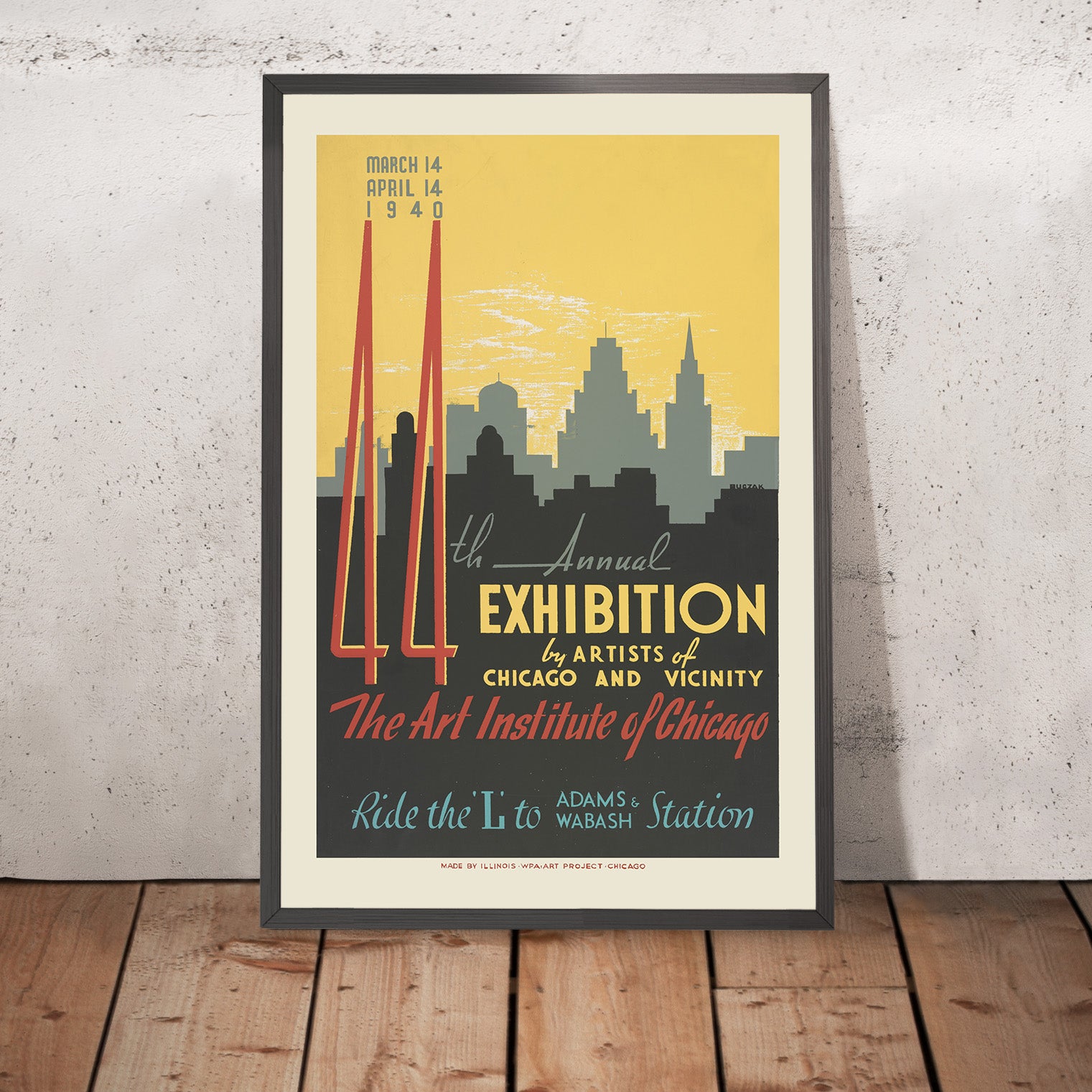 Celebrate the vibrant cultural legacy of Chicago with this striking artwork, "44th Annual Exhibition by Artists of Chicago and Vicinity" by John Buczak, originally created in 1940. This antique travel poster was designed to promote the city's renowned art exhibition, a pivotal event that showcased the creative spirit and talent of Chicago's artists. The poster not only served as an invitation to the exhibition but also stands today as a testament to the dynamic artistic energy that defined the city during the early twentieth century.