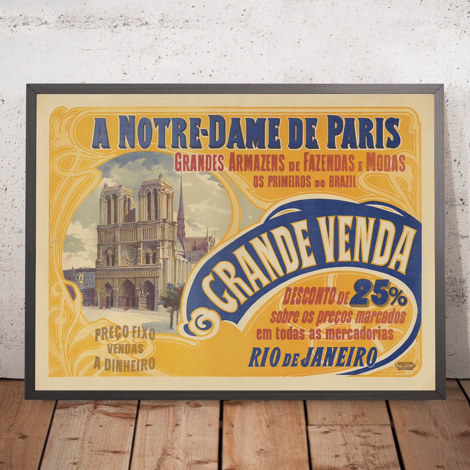 A Notre-Dame de Paris. Grandes armazens de fazendas e modas os primeiros do Brazil. Grande venda by Paul Dupont (1900) captures the glamour and cross‑Atlantic allure of the Belle Époque. Printed in Portuguese for a Rio de Janeiro department store proudly named after Paris’s great cathedral, the poster marries Old World prestige with New World modernity. At left, an oval vignette presents Notre‑Dame’s sculpted façade and rose window under a breezy sky, while a sweeping diagonal ribbon shouts “GRANDE VENDA” and “DESCONTO DE 25%,” anchored by the bold place name “RIO DE JANEIRO.” It’s both a slice of retail history and a love letter to Paris, designed to entice Brazilian shoppers with Parisian style.