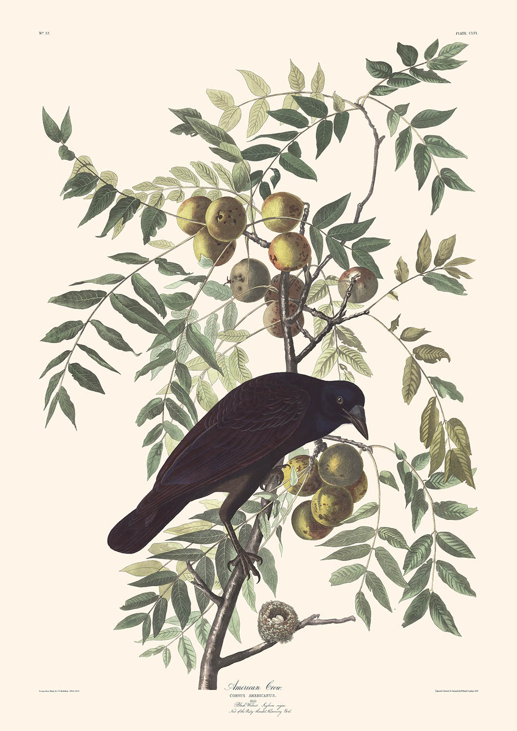 Esta hermosa impresión muestra el hábil uso del color y la composición por parte de Audubon. El cuervo, con sus plumas negras brillantes matizadas con reflejos azulados, se contrasta con el delicado follaje verde del fondo, creando un equilibrio armonioso. Los intrincados detalles capturan la textura del plumaje y la actitud alerta pero cautelosa del cuervo, convirtiéndolo en una pieza de declaración para cualquier habitación.