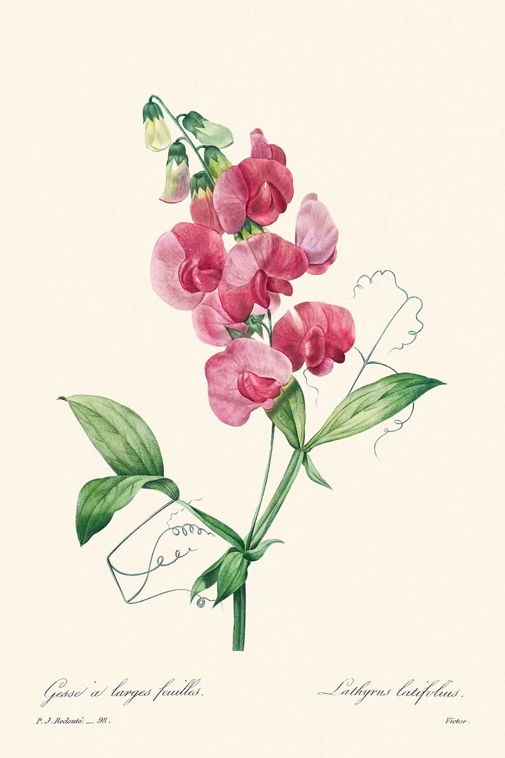 Everlasting Pea, publicada por primera vez en 1802, es una exquisita ilustración botánica del reconocido artista Pierre-Joseph Redouté. Conocido como uno de los mejores ilustradores botánicos, Redouté pasó gran parte de su carrera pintando bellezas florales en el Château de Malmaison a pedido de Josefina Bonaparte, la esposa de Napoleón. Esta obra maestra victoriana ejemplifica hermosamente la habilidad de Redouté para capturar el delicado encanto y los intrincados detalles del guisante eterno (Lathyrus latifolius).