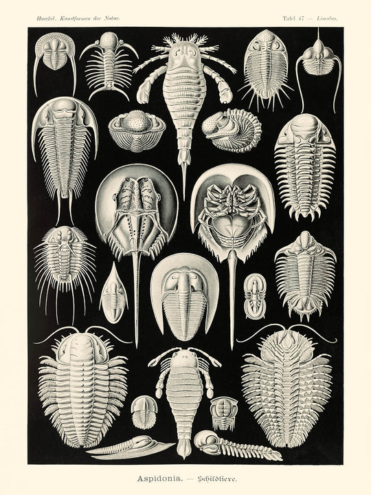 Aspidonia Schildtiere (Tafel 47), creada por el renombrado Ernst Haeckel en 1904, es una exquisita ilustración que muestra la hipnotizante belleza de los cangrejos herradura de su famoso "Kunstformen der Natur". Haeckel, un pionero tanto en biología como en arte, representó meticulosamente estas criaturas marinas con la máxima atención al detalle, convirtiendo esta obra en una verdadera maravilla científica y artística.