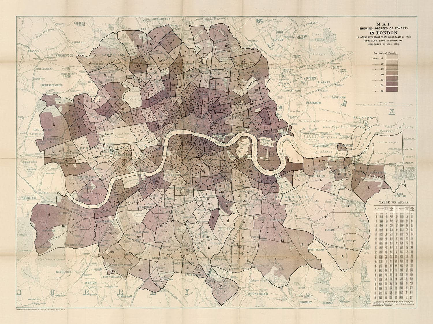 Este mapa fue publicado originalmente en 1889 después de años de encuestas. Si haces zoom en las imágenes de la lista, puedes ver que el mapa base es un mapa bastante detallado de Londres, que incluye la mayoría de las carreteras principales, estaciones de tren, parques, monumentos y canales.