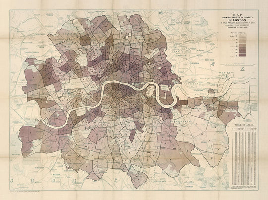 Probablemente notarás que, quizás en contra de tu idea moderna de Londres, el sur de Londres solía tener algunos de los niveles más bajos de pobreza en Londres, mientras que la Ciudad de Londres era realmente bastante sombría. También puedes ver que las áreas cercanas al Támesis parecen tener alta pobreza.