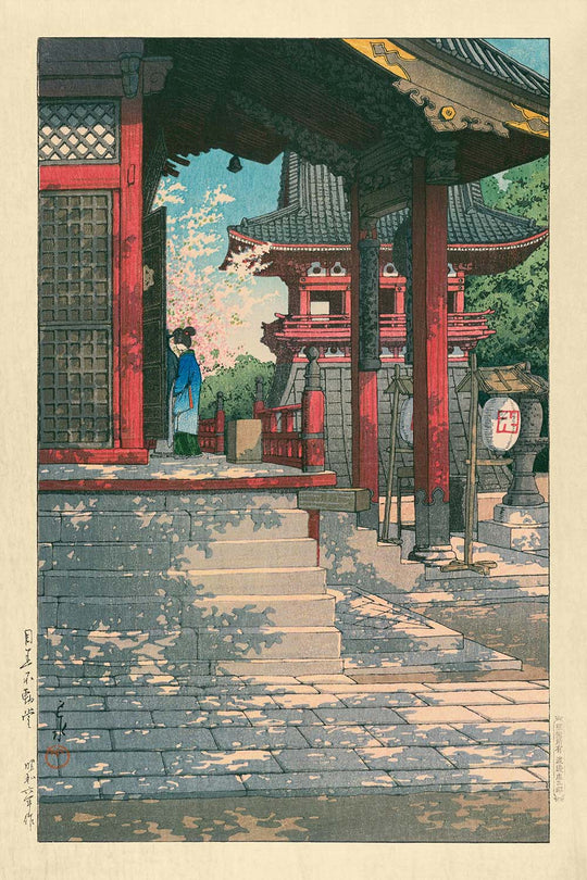 El Templo Meguro Fudo de Hasui Kawase es una impresionante impresión en madera de 1935 que captura bellamente la serena atmósfera de la arquitectura japonesa entrelazada con la esplendor natural. Hasui Kawase, un renombrado artista del movimiento Shin-hanga, es celebrado por su habilidad para encapsular la esencia de la tranquilidad y la sutil belleza del paisaje japonés en su arte. Esta obra refleja la majestad espiritual del Templo Fudo, un sitio significativo e histórico ubicado en el distrito de Meguro.
