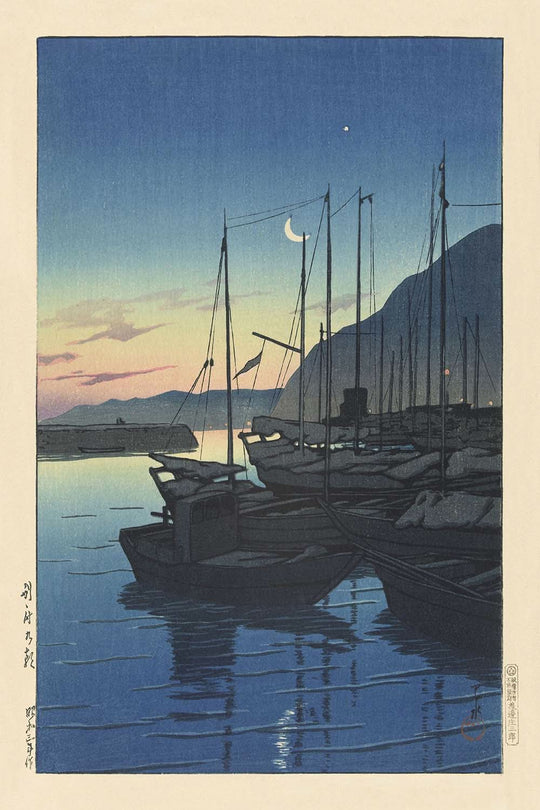 La obra de arte se destaca por su exquisito juego de colores: los suaves azules y verdes se combinan con los suaves tonos cálidos del amanecer, creando una escena tranquila e inmersiva. El delicado equilibrio de luz y sombra invita a los espectadores a un momento de paz reflexiva. Tener una impresión de Morning in Beppu te permite traer un pedazo de la belleza idílica de Japón y el legado artístico de Kawase a tu espacio.