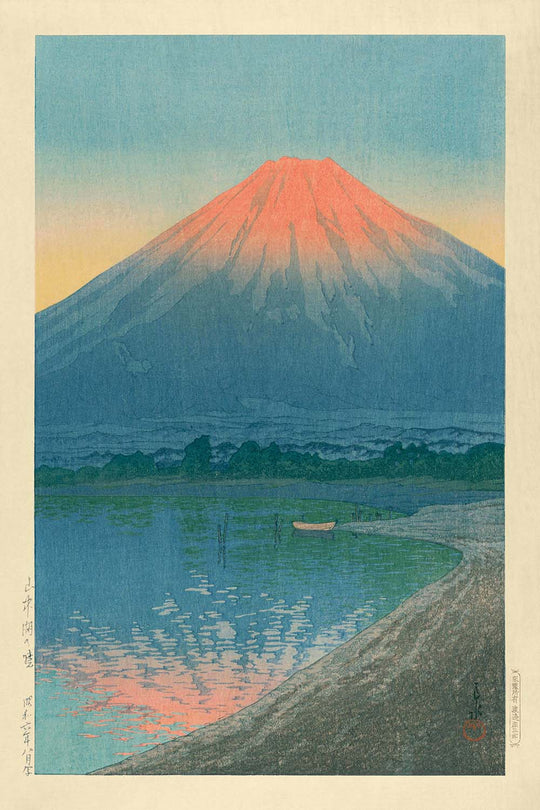 La composición equilibrada sin esfuerzo y la habilidad de Kawase para representar texturas naturales otorgan a esta impresión profundidad y movimiento. Los vibrantes contrastes entre la superficie reflectante del Lago Yamanaka y la cima nevada del Monte Fuji crean un dinámico juego visual—una invitación a perderse en la contemplación.