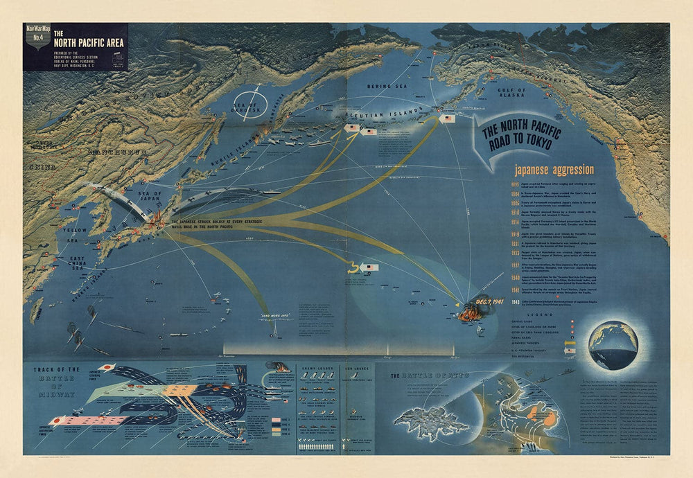Hay 6 mapas en la serie, cada uno centrado en un aspecto o teatro diferente de la Primera Guerra Mundial 2. Este mapa, No. 4, se centra en el teatro del Pacífico y la "línea de tiempo de la agresión japonesa" en la región desde 1895 hasta la perla. Ataque del puerto en 1941.