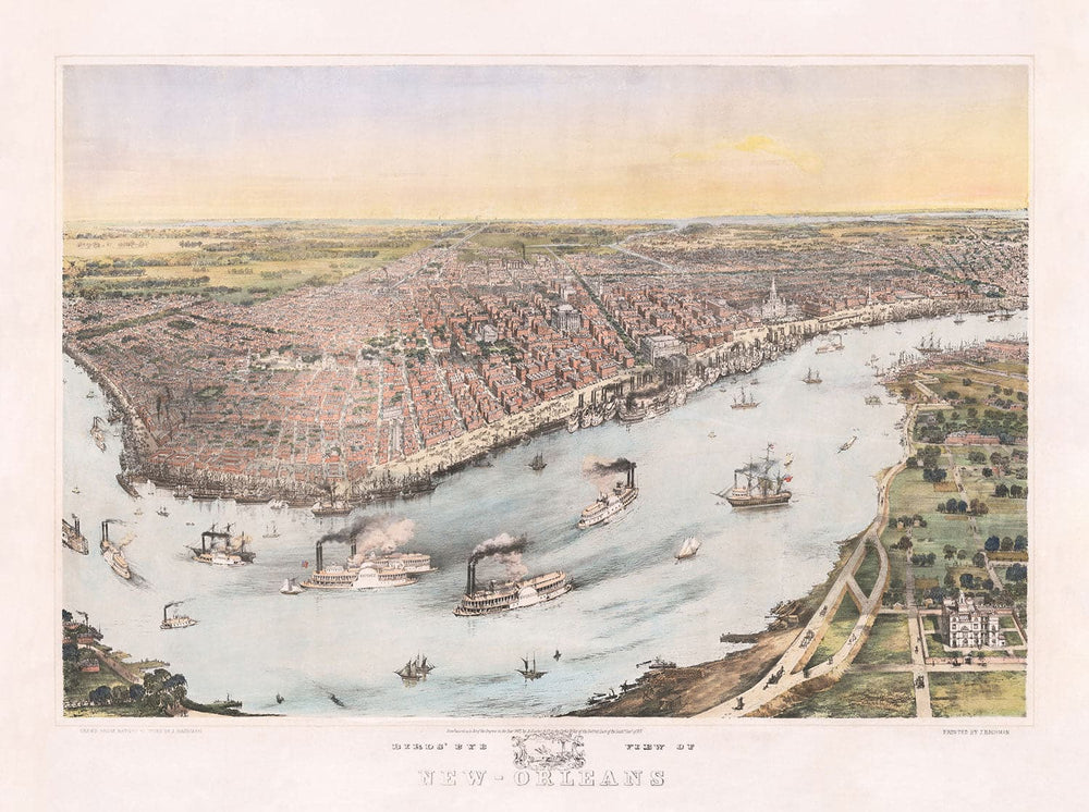 Mapa de ojos Old Birds de Nueva Orleans en 1851: Barrio Francés, CBD, Treme, Río Mississippi, Catedral de San Luis, Jackson Square
