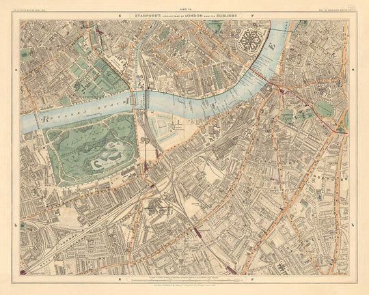 El mapa se publicó originalmente en 24 hojas. En total, el mapa habría medido aproximadamente 2 metros de ancho (78 pulgadas). Este aquí es la hoja 14, que se centra en Battersea y Chelsea y los distritos del sur de Londres de Wandsworth, Lambeth y Kensington y Chelsea.