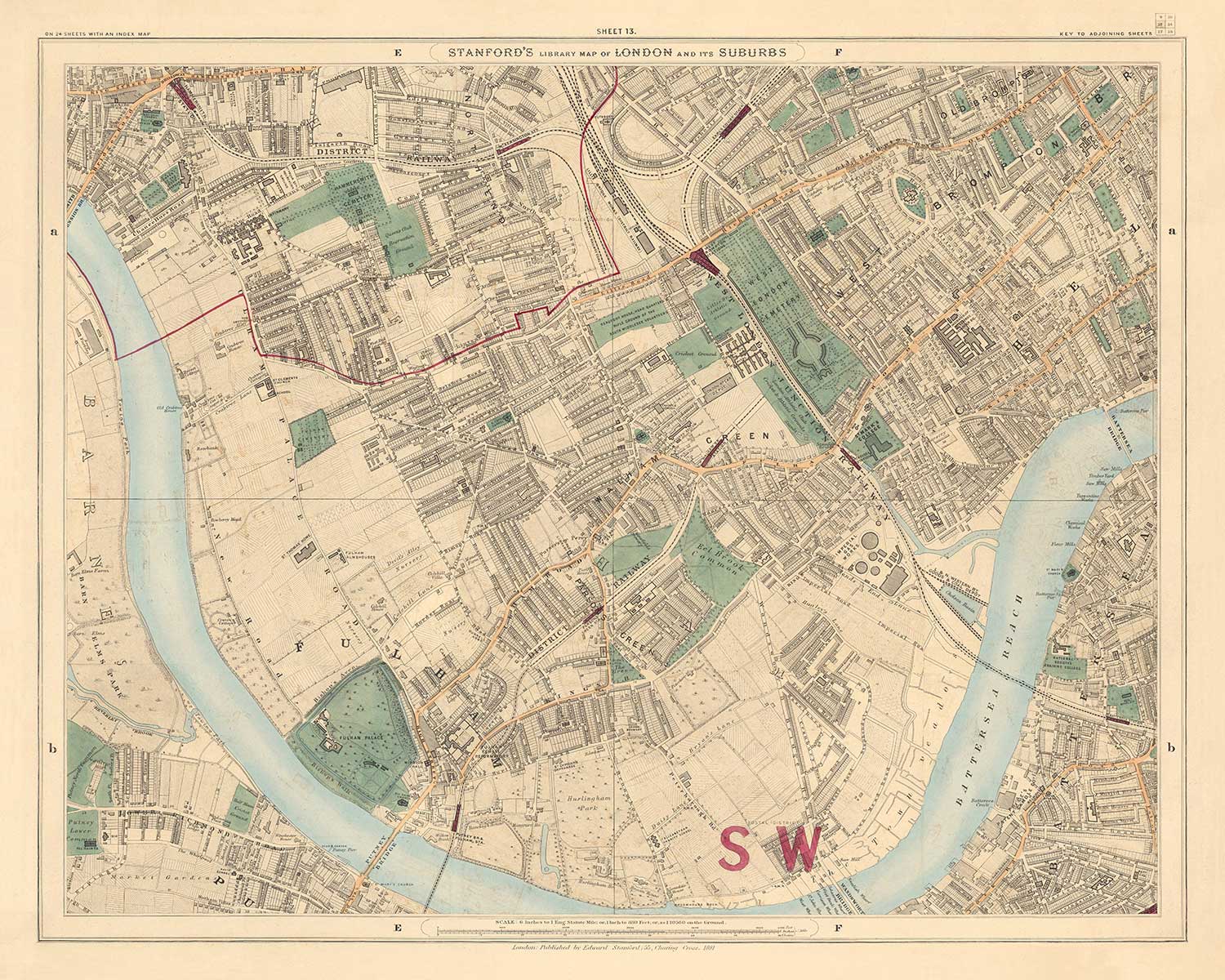 El mapa se publicó originalmente en 24 hojas. En total, el mapa habría medido aproximadamente 2 metros de ancho (78 pulgadas). Este aquí es la hoja 13, que se centra en el oeste de Londres, específicamente Fulham y West Brompton, con partes de Hammersmith, Chelsea, Battersea y Putney.