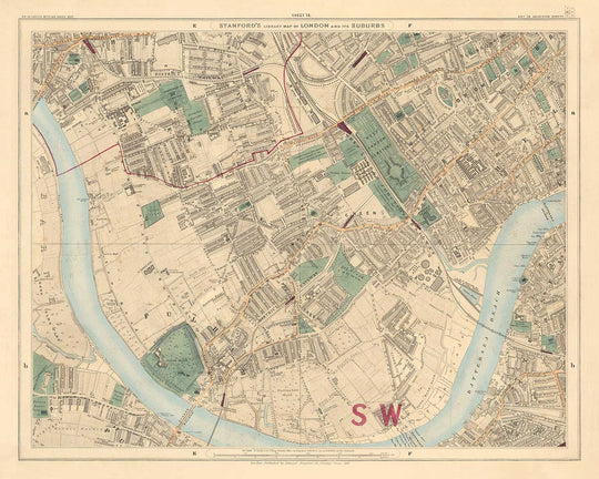 Originalmente aclamada como "el mapa más perfecto de Londres que se ha emitido" por la Royal Geographical Society cuando se publicó en 1862, es seguro decir que el mapa de Londres de Edward Stanford fue una obra maestra de la cartografía. Este aquí es un hermoso mapa coloreado a mano de la edición de 1891 del mapa de Stanford.