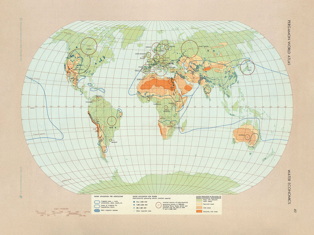 Antigua infografía del mapa de la economía del agua mundial, 1967: Utilización del agua, Agricultura, Energía hidroeléctrica