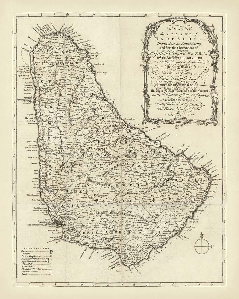 Thomas Jefferys, un reconocido cartógrafo inglés, fue célebre por sus detallados mapas de las colonias americanas. Su colaboración con el reverendo Hughes dio como resultado un mapa que es a la vez una obra maestra artística y un documento histórico. Hughes, que se desempeñaba como rector de la parroquia de Santa Lucía, utilizó sus agudas habilidades de observación para capturar las características naturales de la isla, desde sus suaves pendientes hasta sus escasos pero importantes ríos. Este mapa es un testimonio de su experiencia combinada y dedicación a la precisión.