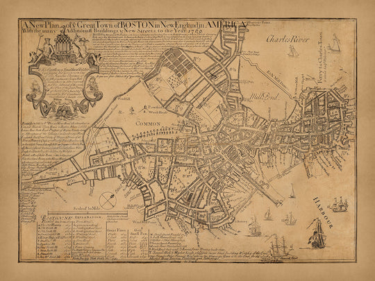 Otro aspecto interesante del mapa es la forma en que muestra la relación de la ciudad con el área circundante. El mapa incluye el río Charles y el puerto de Boston, mostrando cómo la ciudad estaba conectada con el mundo exterior. Además, el mapa muestra las ciudades cercanas de Charlestown, Roxbury y Dorchester, proporcionando una sensación de la geografía de la región.