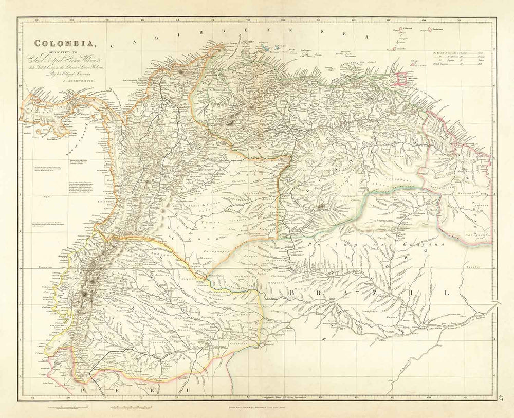 Mapa antiguo de Colombia, 1834 por Arrowsmith: Gran Colombia, Venezuela, Ecuador, Perú, Caribe, Panamá