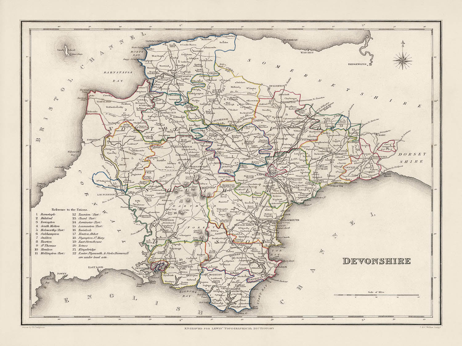 Lo que hace que este mapa sea verdaderamente notable no es solo la profundidad y el detalle con los que representa Devonshire, sino también su importancia histórica. Datado a mediados del siglo XIX, este documento auténtico ofrece una instantánea de los asentamientos y puntos de referencia geográficos de Devon tal como existían antes de la significativa expansión urbana y el desarrollo industrial. En una época anterior a la imagen satelital y la tecnología GPS, el mapa de Lewis es una impresionante hazaña de cartografía que captura fielmente los intrincados detalles geográficos de Devon y su vasta gama de asentamientos.