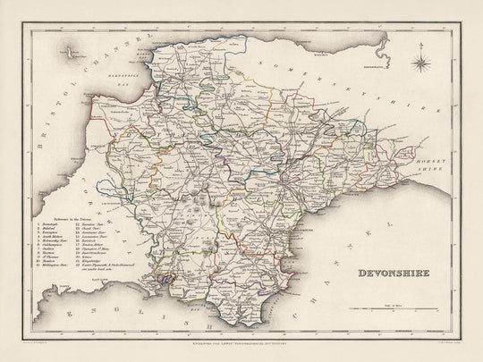 Experimenta un viaje al pasado con este exquisito mapa de Devonshire de 1844, creado por el renombrado cartógrafo Samuel Lewis. Este impresionante relicario de la era victoriana está impregnado de la rica historia del condado, revelando sus asentamientos, características geográficas y eventos históricos. Desde las bulliciosas ciudades de Exeter y Plymouth hasta los pintorescos pueblos a lo largo del río Dart, el mapa pinta un vívido retrato del paisaje de Devon hace casi dos siglos. Un tesoro para los aficionados a la historia, los entusiastas de la cartografía y los devonianos por igual, proporciona una fascinante visión de una época en la que las modernas ciudades del condado estaban en su infancia o aún no se habían fundado, y algunos lugares podrían existir bajo sus nombres anteriores.