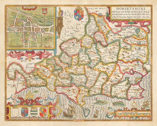 Esta antigua, colorida y extremadamente rara mapa muestra el antiguo condado de Dorset (o Dorsetshire) tal como era en 1611. Fue creado por John Speed y grabado por Jodocus Hondius, y publicado originalmente en "El Teatro del Imperio de Gran Bretaña" de Speed.