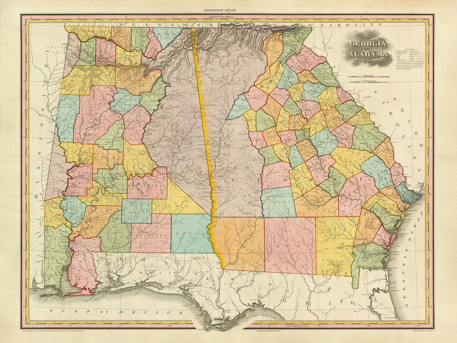 Antigua mapa de Georgia y Alabama por H. S. Tanner, 1820: Atlanta, Savannah, Augusta, Columbus (GA) y Montgomery