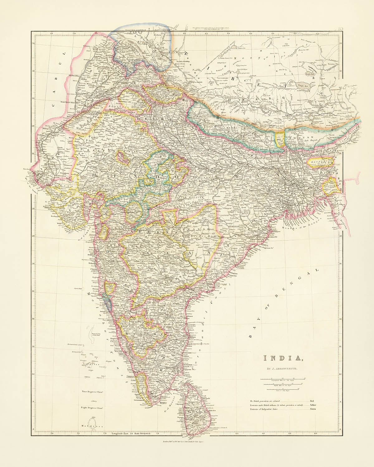 El mapa de 'India' de Arrowsmith es un testimonio de la capacidad del cartógrafo para unir estética con precisión. Las características físicas de la región, incluida su diversa topografía, están bellamente representadas. Las escarpadas cadenas montañosas del Himalaya, las fértiles llanuras del Ganges y los densos bosques de los Ghats Occidentales están todos capturados con el ojo artístico para el detalle. La representación de fenómenos naturales y puntos de referencia en el mapa no solo es científicamente precisa, sino también artísticamente placentera, convirtiéndolo en una verdadera obra maestra del arte cartográfico.