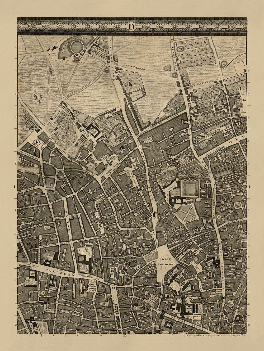 Mapa antiguo de Londres, 1746 por John Rocque, D1: Holborn, Clerkenwell, Farringdon, Barbican, Westminster, City of London, Smithfield Market