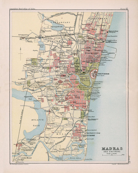 Este mapa de 1893 del centro de la ciudad de Madrás (ahora conocido como Chennai), publicado originalmente por JG Bartholomew, es un mapa político detallado que ofrece una fascinante visión del pasado de la ciudad. El mapa cubre una parte significativa de la ciudad, incluyendo los barrios de Royapuram en el norte, Purasawalkam en el oeste y Mylapore en el sur, así como todas las demás regiones modernas que ahora están cubiertas en esta área.