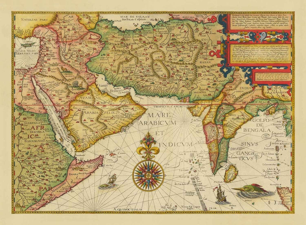 Una de las mapas más antiguas y hermosas del Medio Oriente y la India, fue publicada por el gran maestro holandés Jan Huygen Van Linschoten en 1596.