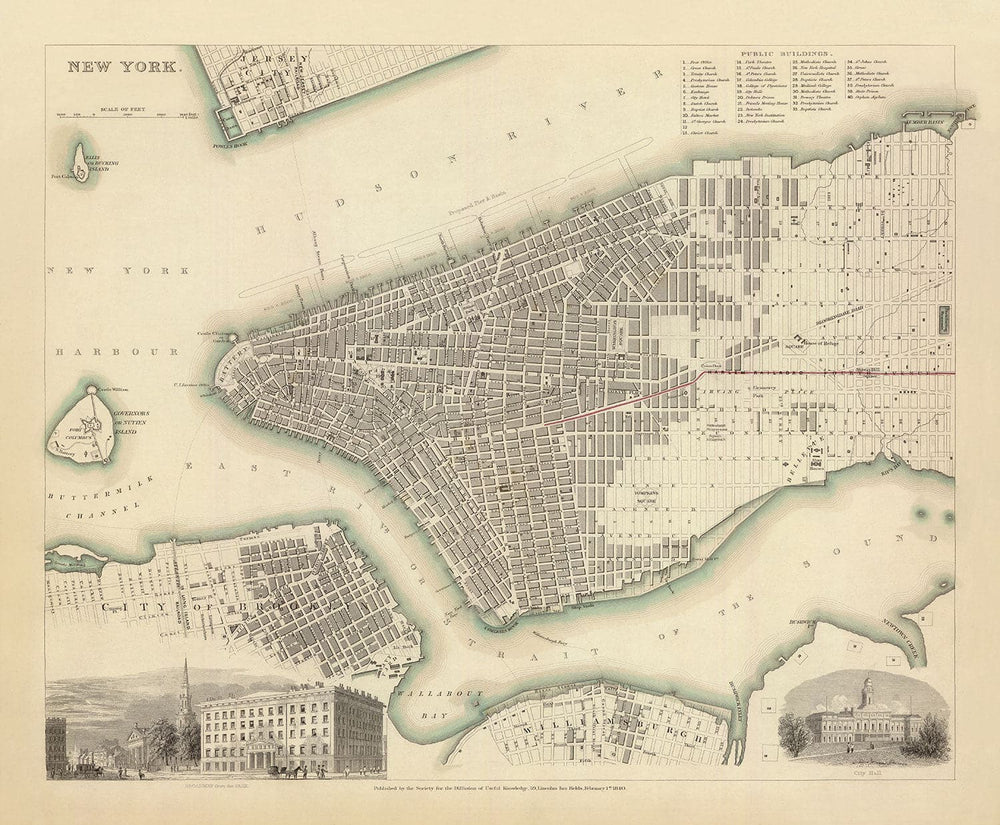 Viejo Mapa de Nueva York, Estados Unidos en 1840: Manhattan, Brooklyn, Williamsburg, Hudson River
