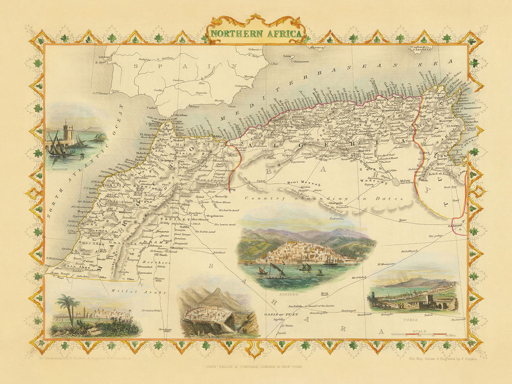 También es destacable el estilo decorativo del mapa. El uso de colores vibrantes y bordes intrincados aumenta su atractivo estético, convirtiéndolo en una adición visualmente agradable a cualquier colección. El título del mapa, "África del Norte", se muestra de forma destacada en la parte superior y la escala y la orientación están claramente indicadas, lo que garantiza la facilidad de uso.