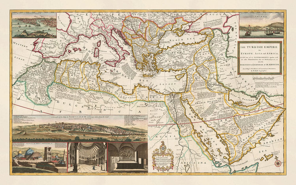 Este mapa magistral del Imperio Turco fue creado en 1714 por Herman Moll, el mejor cartógrafo y fabricante de mapas inglés del siglo XVIII.