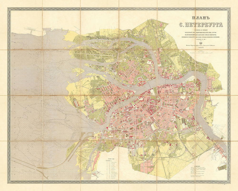 San Petersburgo, con su intrincada red de canales y ríos, está bellamente representada en este mapa, destacando el río Neva y sus numerosos brazos que atraviesan la ciudad. El estilo semipictórico del mapa detalla meticulosamente la cubierta vegetal y los edificios individuales, ofreciendo una combinación única de precisión artística y cartográfica. Lugares destacados como el edificio del Almirantazgo, la Catedral de San Isaac y el Palacio de Invierno ocupan un lugar destacado, lo que proporciona una ventana al esplendor arquitectónico de la época.