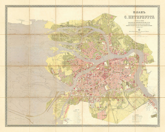 El mapa también captura la esencia de los vibrantes barrios de San Petersburgo, incluidos la isla Vasilyevsky, el distrito Liteyny y el distrito Nevsky. Estas áreas, representadas con notable claridad, revelan el carácter diverso de la ciudad y su evolución hacia una metrópolis bulliciosa. La inclusión de barrios de bajos ingresos en las afueras de la ciudad subraya los cambios sociales y la expansión urbana que acompañaron el crecimiento industrial de San Petersburgo.