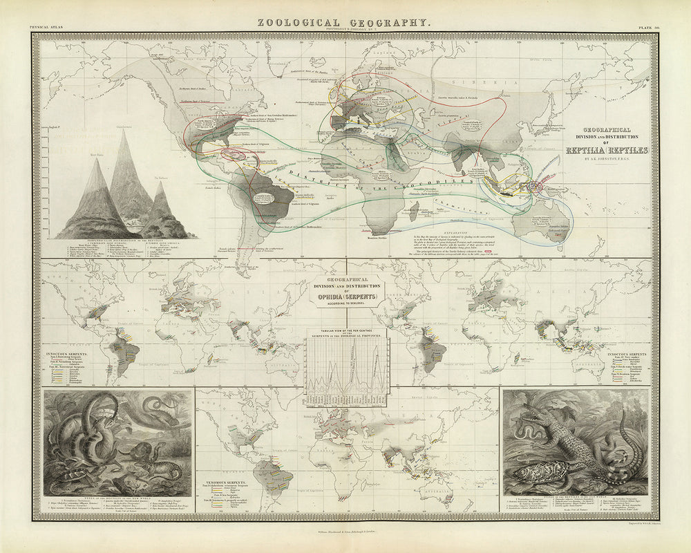 Este mapa del mundo de 1856 muestra la distribución de serpientes, lagartos y otros reptiles realizado por AK Johnston y es una mirada fascinante al mundo natural tal como se entendía a mediados del siglo XIX.