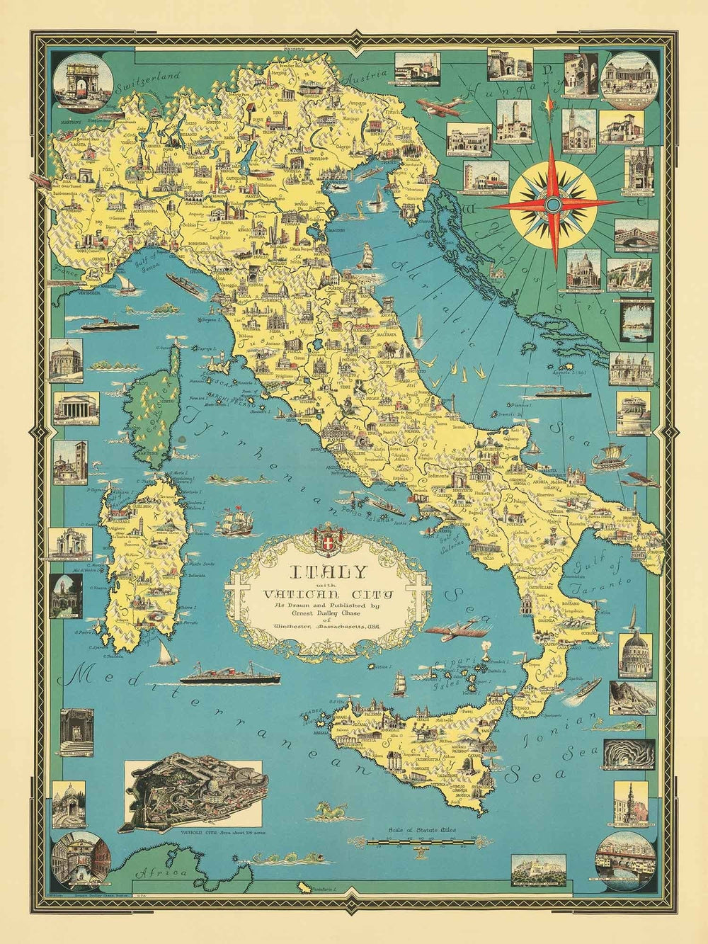 Antiguo mapa pictórico de Italia, 1935 por E. Chase: Hitos ilustrados, Vaticano, Venecia, Florencia, Roma, Cerdeña