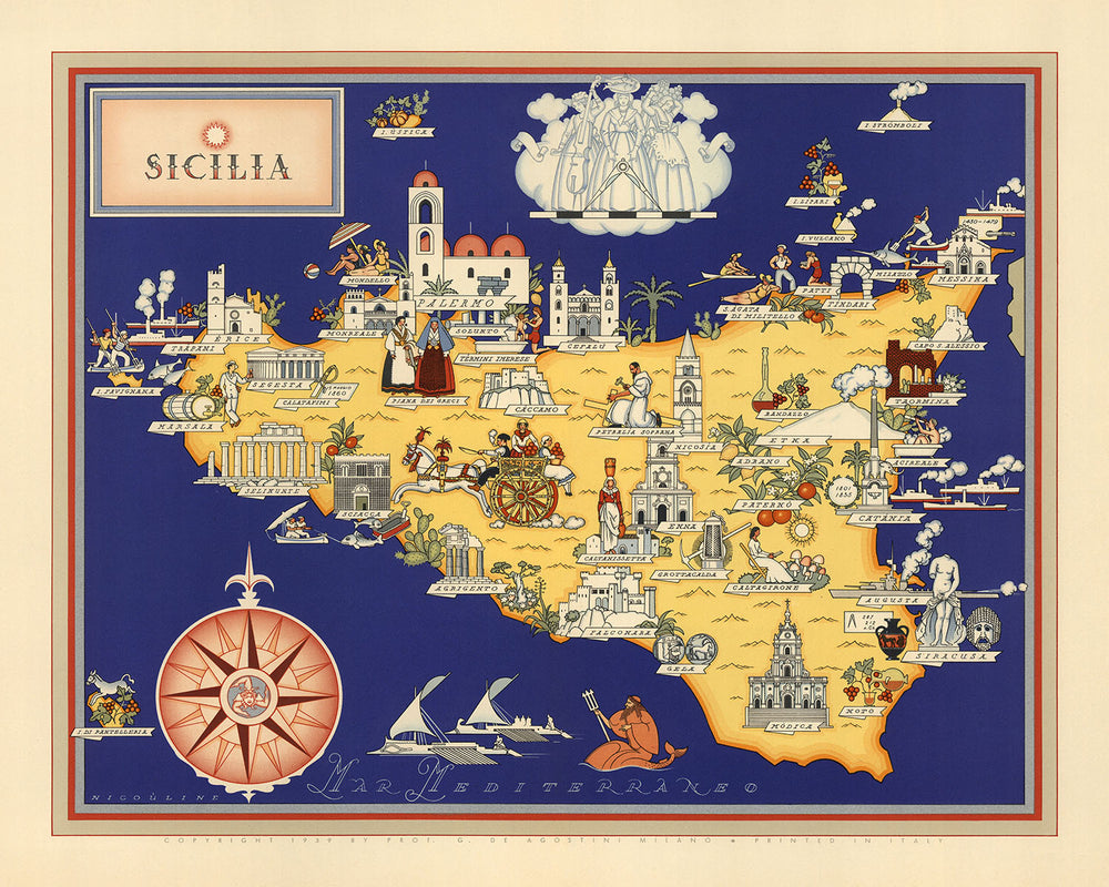 El mapa de De Agostini no sólo sirve como referencia geográfica sino también como narrativa visual de la historia y la cultura de Sicilia. El mapa presenta ilustraciones de ruinas antiguas, castillos medievales e iglesias barrocas, que reflejan el rico patrimonio arquitectónico de la región. Además, muestra las tradiciones locales, como la producción de aceite de oliva, vino y cítricos, lo que brinda información sobre la economía y las prácticas agrícolas de la región.