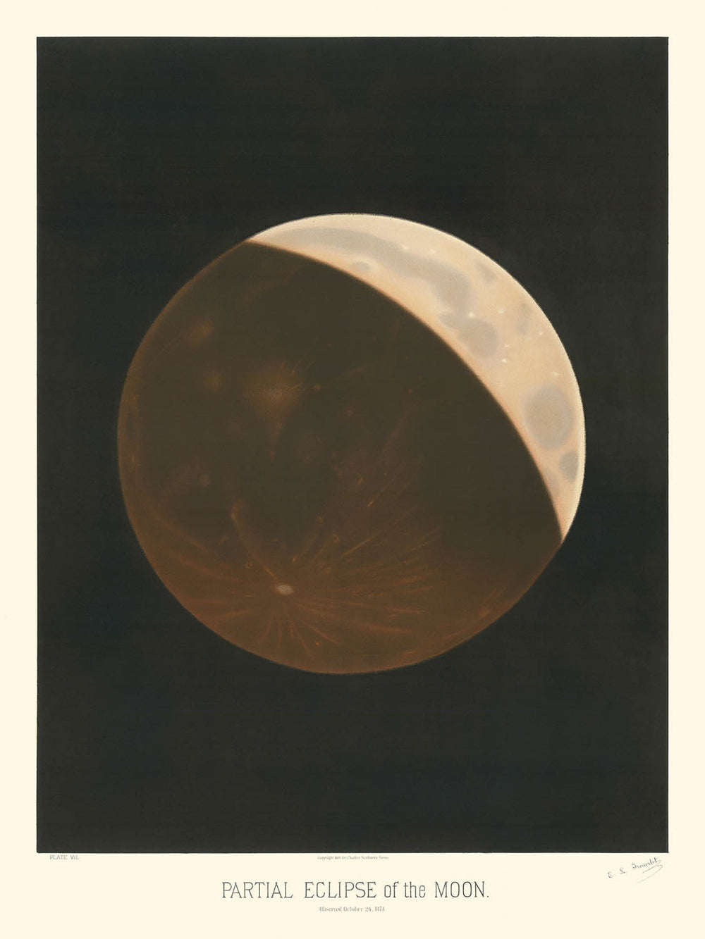 Esta litografía en particular retrata un eclipse parcial con asombroso realismo y complejidad. El único tono rojo profundo de la "luna de sangre" se logra mediante la dispersión de Rayleigh de la luz solar refractada, haciendo que esta impresión no sea solo una obra de arte, sino un instante de eventos astronómicos notables. El contraste entre las porciones iluminadas y sombreadas de la luna ofrece un estudio marcado, pero armonioso, de la topografía lunar que es tanto informativa como visualmente atractiva.