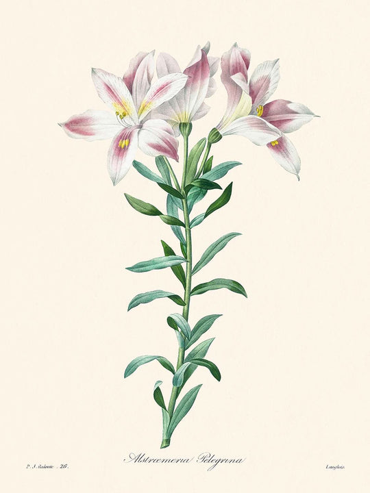 Adéntrese en el mundo de la elegancia botánica con "Lirio peruano", una exquisita ilustración botánica victoriana del famoso Pierre-Joseph Redouté, publicada por primera vez en 1827. Conocido como uno de los grandes maestros del arte botánico, Redouté dedicó una parte importante de su carrera a pintar la flora por orden de Josefina Bonaparte, capturando la diversa belleza que adornaba el Château de Malmaison.