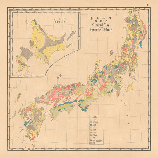El mapa es un infográfico ejemplar, utilizando una leyenda codificada por colores sofisticada para representar diversas formaciones geológicas. Este enfoque visual no solo hace que el mapa sea estéticamente agradable, sino también altamente informativo, permitiendo a los usuarios distinguir fácilmente entre diferentes tipos de rocas y períodos geológicos. El mapa en inserto de Hokkaido añade una capa extra de detalle, asegurando que incluso las regiones más remotas estén completamente cubiertas. Este nivel de detalle y claridad es un testimonio de las avanzadas técnicas cartográficas empleadas por los creadores del mapa.