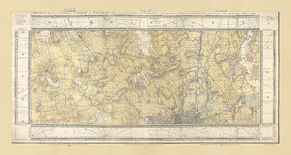 Mapa antiguo raro de Londres y suburbios, 1799 por Milne: Ciudad, Hackney, Westminster, Dalston, Hampstead, Campos